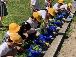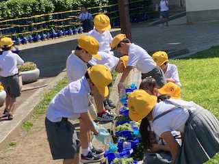 1年生の子どもたちが育てているアサガオがあざやかな緑色をした芽を出しています。子どもたちが毎日頑張って水やりをしてきたおかげですね。今日はさらに元気に育つようにみんなで肥料をあげていました。一袋に7.8つぶ入っている肥料をそっと植木鉢にまいていきます。そして『大きくなあれ』と願いを込めて水やりをしました。そろそろツルが伸びてくるので支柱を立てないといけませんね。何色のアサガオが咲くのかな?楽しみです。