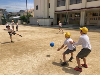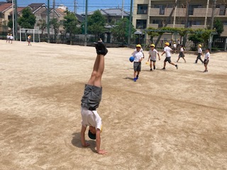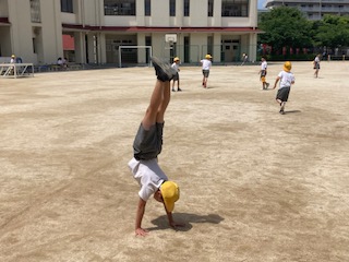 えーっ!今日もとてもいい天気です。休み時間にはたくさんの子どもたちが運動場に出てきて元気よく遊んでいます。そんな子どもたちの様子を見ていると、えーっ!・・・、運動場の真ん中で逆立ちをしている子を見つけました。友だちとドッジボールをしながら時々逆立ち…、逆立ちをしながら時々ドッジボール…をくり返す子を発見です。まわりの友だちは慣れているのか驚きません。思わず近寄ってリクエストしてしまいました。