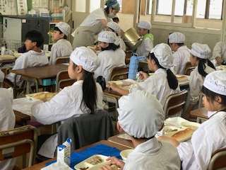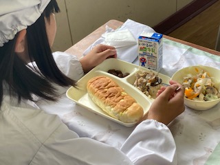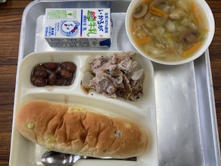 今日の給食のメニューは、豚肉のバジル焼き、鶏肉とキャベツのスープ、うずら豆のグラッセ、牛乳、パンでした。豚肉のバジル焼きはワインと塩こしょう、綿実油、バジルで下味をつけて、玉ねぎを混ぜ合わせて香りよく焼いています。鶏肉とキャベツのスープは彩りもきれいで野菜も多く、マッシュルームの食感がアクセントになっていました。うずら豆のグラッセは上品な甘さを感じました。グラッセはフランス料理の一つでバターを加えて煮詰め、つやを出したものです。給食ではバターの代わりにオリーブ油でつやを出しています。