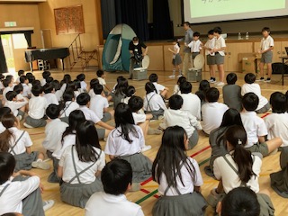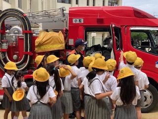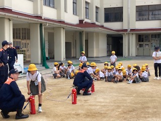 2時間目には各学年の実態に合わせた内容で防災学習を行いました。東淀川区役所や東淀川消防署と連携しています。防災DVDによる学習(1年)、消防車の紹介や隊員の仕事、水消火器体験(2.3年)、地震や水害などの被害状況や避難生活の様子、防災意識の向上(4.5.6年)など、多岐にわたっています。子どもたちは関心をもってしっかりと話を聞いていました。