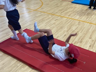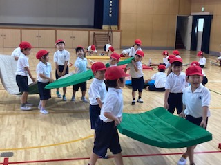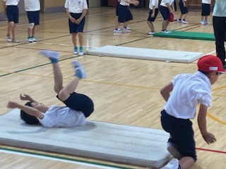 講堂をのぞいてみると、1年生の子どもたちが楽しそうにマットの上をころころころころ転がっています。上手に転がることができなくても大丈夫です。マットの上で背中やお腹、頭やお尻をつけて体を動かす感覚を身につけていくことがねらいです。先生もやさしく見守ります。動きのよいところやみんなに真似させたい動きを見つけたときには、子どもたちを集めて紹介します。終わった後はマットもみんなで片付けます。力を合わせてみんなで運ぶ姿が可愛らしいですね。