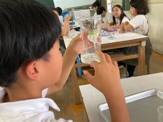 土の種類と水のしみこみ方にはどんな関係があるのだろうか。4年生の子どもたちが理科室で実験を通して調べています。土のつぶの大きさ(校庭の土、砂場の土、小石の混ざった砂利)によって違いがあるのかな。ペットボトルで実験装置を作りました。結果は…OKです。子どもたちはきちんと結果を導き出すことができたし、ノートにまとめることもしっかりとできていました。
