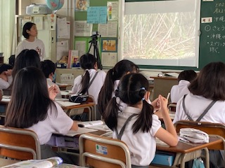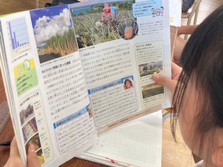 5年生の子どもたちが社会の授業で[あたたかい気候を生かして]から、沖縄の盛んな農業について学習していました。沖縄と言えば…いろいろな意見やイメージが出てきました。さとうきび、パイナップル、シークヮーサー、マンゴーなどが有名ですね。先生に映像でも農業の様子について見せてもらいました。教室の後ろには子どもたちの顔や目標が掲示されていて、カラフルで楽しい雰囲気の教室になっていました。