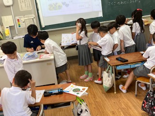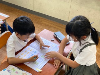 1年生の子どもたちが先生のところに列を作って並んでいます。算数のたし算の問題で、文章問題です。『○をつけて』…答えが書けたら先生に見てもらって○をつけてもらいます。1回目で合格するかな…でも間違えても大丈夫、先生がその場でやさしく教えてくれます。『合格したらまだのお友だちに教えてあげましょうね』と先生が言うと、『だれかーおしえてほしい人 いませんかー』と声をかけて回る1年生の子どもたちです。