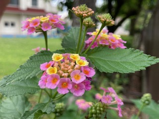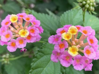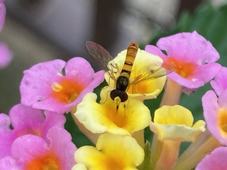 芝生広場のすみに小さな一株だけですが、きれいなピンクと黄色の花を咲かせている[ランタナ]があります。パッと見た感じはアジサイ(ガクアジサイ)に似ています。ガクアジサイの周りのものは[花]ではなく[ガク]であり、ランタナのそれは[花]であって[ガク]ではありません。ランタナは『七変化』と呼ばれ、同じ茎から複数の色の花が咲き、開花後に徐々に色が変化していくのが特徴です。ハチの仲間??がちょうどミツを吸いにやって来ていました。