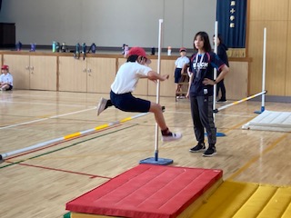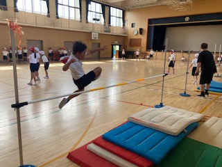 4年生の子どもたちが講堂で[走り高跳び]に挑戦していました。リズムよく円を描くようにバーと平行になる形で走り込み、タイミングよく踏み切って大きく足を振り上げます。まだなかなか上手なフォームで跳ぶ子は見当たりません。これからですね。まずは高さは気にせず、バーを怖がらずに、といったところから始めていけばいいと思います。子どもたちは結構楽しんで跳んでいました。でも来週からはプールですね。続きは雨の日とかですね。