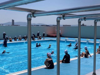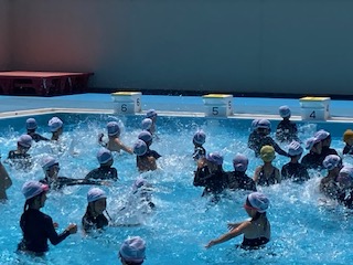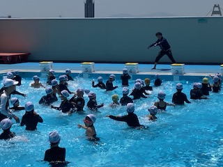 ギラギラ照りつける太陽の日差しを浴びながら、2年生の子どもたちも元気よくプールに入りました。6月中旬ですでに全国各地で猛暑日を観測し、熱中症等に気をつけていく必要が出てきています。水泳指導においても最善の注意を払いながら進めていきます。しかし子どもたちは一年ぶりのプールにテンションも高まり、水慣れの段階からかなりはしゃぎ気味でした。子どもたちの楽しんでいる声がご近所さんにも届いているのではないかと思います。
