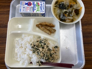 今日の給食のメニューは、いわし天ぷら、五目汁、鶏菜っ葉炒め、牛乳、ごはんでした。いわし天ぷらは菜種油で揚げたいわしに砂糖とみりん、米酢、醤油で作った甘めのタレがかかっています。五目汁はキャベツ、玉ねぎ、たけのこ、にんじん、わかめが入っていて彩りもきれいでした。鶏菜っ葉炒めは油漬けささみと大根菜を一緒に炒めていて、ごはんによく合う一品です。