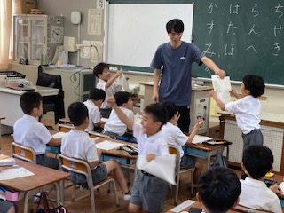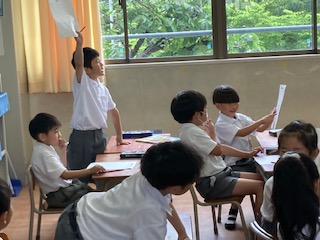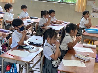 今日も天候やプールの状況から考慮して1年生の水泳指導を取りやめました。そこで子どもたちを楽しませてあげようと先生が考えたのが[ひらがなビンゴ]です。習ったひらがなを使ってビンゴ大会を開きました。先生が文字を発表するたびに悲鳴が起こります。『キャー!キャー!』…本当に悲鳴と言っても言い過ぎでないくらい、子どもたちは盛り上がって叫んでいました。お願いポーズもとび出します。おそらくプールよりも体力を使っていると思います。『ビンゴーっ!』…ビンゴになった子たちは全力で先生に見せに行っていました。
