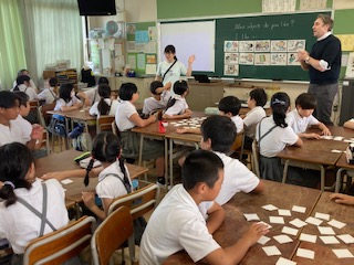 5年生の子どもたちが英語の授業をしていました。とても楽しそうに進んでいきます。英語を使った簡単なゲームやコミュニケーションを主体とした交流を取り入れることで、子どもたちも生き生きと活動することができていました。授業に工夫が見られます。指導する先生とライアン先生の息もピッタリでした。二人の掛け合いに子どもたちも自然と引き込まれていました。