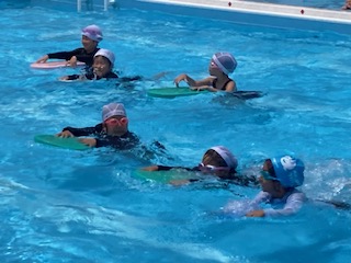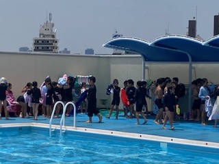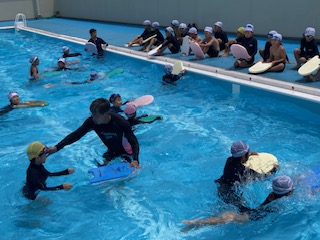 2年生の子どもたちが[けのび]の練習です。1年生のときはほとんど水慣れの時間でしたが、2年生になると少しずつ技能も高めていかなければいけません。今日はビート板を使って[けのび]を中心に練習しました。プールの壁や床を蹴って勢いよく前へととび出します。そしてできるだけ体をピンと伸ばして、止まったらまたくり返します。みんな少しずつ上手になってきました。素直に取り組む2年生の子どもたちです。見ていて気持ちがいいですね。