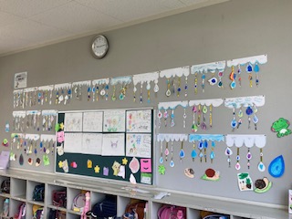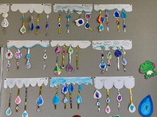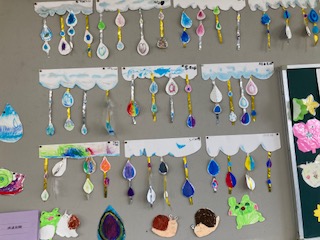 2年生の教室の後ろに子どもたちの作った作品が掲示してありました。最初は何かの飾りかなと思っていたのですが、[しずく(雫?滴)]でした。テーマは[キラキラ雨のしずく]だそうです。アクセサリーのようで確かにキラキラしています。雨のしずくも想像をふくらませるといろいろな題材になるのですね。2年生の子どもたちのキラキラが光っていました。