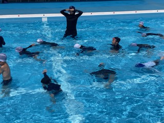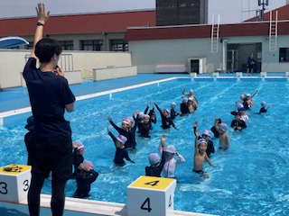 1年生の子どもたちも小学校の大きなプールにすっかり慣れました。誰も怖がらずに元気に入っています。先生の『みんな浮くことができるかな?』…子どもたちの『できるー!』『そんなんできるわー!』『かんたん!』…期待通りの反応です。せーの、子どもたちは一斉に体を水にゆだねます。これまでは水の中を走ったりジャンプしたり、水に顔をつけたりでしたが、今日は[浮く]です。少しハードルが上がりました。みんな少しずつ動きのコツを身につけていってます。