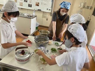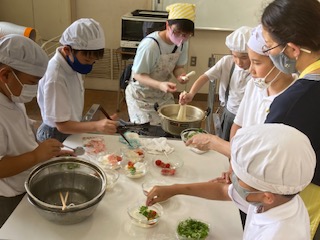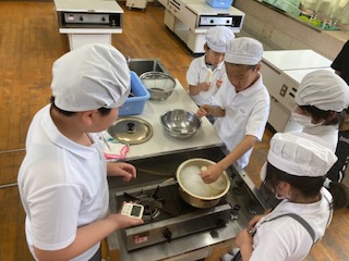 午前中になかよし学級の仲間が家庭科室に集まって、みんなで[そうめん作り]をしました。暑い季節にはぴったりです。この日に向けて6年生の子どもたちが先生たちと一緒に準備や計画を進めてきました。下級生の子たちに[どんな役割をしてもらおうかな][安全に楽しく作るためには何に気をつけたらいいかな]などを考え、今日もリーダーシップをしっかりと発揮して大活躍でした。グループに分かれて手順を確認しながら、みんななかなかの手際の良さでした。