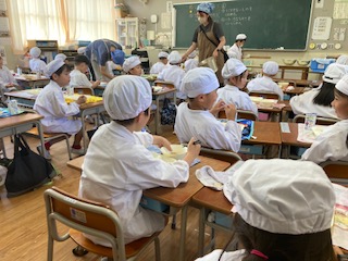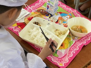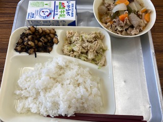 今日の給食のメニューは、豚肉と野菜の煮物、ひじき豆、ささみとキャベツのごまみそ焼き、牛乳、ごはんでした。豚肉と野菜の煮物はしいたけのもどし汁を使っているので味に深みが感じられ、具材にもしっかりとだしかしみ込んでいました。ひじき豆はでん粉をまぶして菜種油で揚げた大豆に、ひじきが入った甘辛い調味液をからませています。ささみとキャベツのごまみそ焼きは油漬けのささみを使っているのでやわらかい食感とごまみその風味が味わえました。