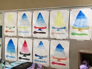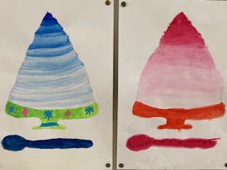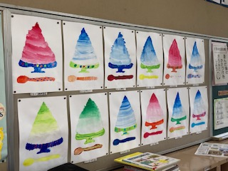 3年生の教室がとても涼しげです。教室の後ろに色とりどりの[かき氷]がたくさん並んでいます。みんな何味でしょうか。グラデーションを利用して描いた子どもたちの作品です。どれもひんやり冷たそうで、この暑い毎日にぴったりです。あー食べたい!でも結局は食べられないので、やっぱり暑いよー!