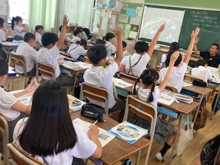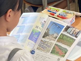 5年生の子どもたちが理科の授業で[台風]の学習をしていました。日本では夏から秋にかけて台風が近づいてきます。台風と天候の関係はどうなっているのだろうか。連続した台風の雲画像や各地の天気図などを見比べながら、子どもたちは気づいたことを進んで発表していました。大阪にやって来た2018年の台風21号はみなさんの記憶にも残っているところです。先生が当時の学校での被害についてや、大規模な停電や交通障害が起こり地域によっては避難が行われたこと、関空連絡橋に大型タンカーが衝突したことなどを話してくれました。