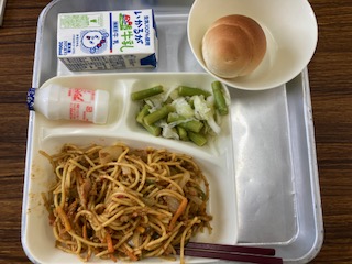 今日の給食のメニューは、カレースパゲッティ、グリーンアスパラガスとキャベツのサラダ、発酵乳、牛乳、パンでした。カレースパゲッティは豚ひき肉とベーコンをにんにくと一緒に香りよく炒めて、細かく刻んだ野菜も多めに加えています。カレー味なので子どもたちも大好きなメニューです。グリーンアスパラガスとキャベツのサラダはさっぱりとした口あたりで、アスパラガスの緑があざやかでした。発酵乳は一人一つです。