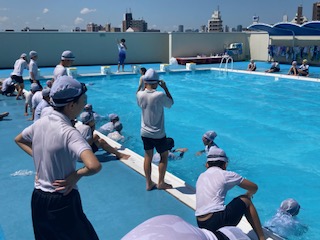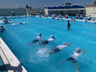 今日は5.6年生の子どもたちがそれぞれ夏休みに向けて[着衣水泳]の授業を行いました。現時点でも日本全国において水難事故が多発し、連日ニュースなどで報道されています。夏休み前に、子どもたち自身が自分の命を守るための指導の一環として着衣水泳は効果があります。着衣水泳を体験することで、自ら危険を察知し、危険な場所に立ち入ったり危ない行動をとったりしないようにしてほしいと思います。本来は長ズボンなどの普段の服装で行う方がよりわかりやすいのですが、体操服を着て行いました。水の中に衣服を着たまま入ると、動きづらいこと、泳ぎが得意な人でも溺れてしまう可能性があることなどが体験を通してわかりました。