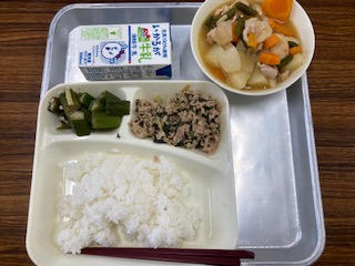 今日の給食のメニューは、鶏肉と一口がんもの煮物、オクラの梅風味、ツナっ葉炒め、牛乳、ごはんでした。今日で1学期の給食が終わりました。学校給食にご理解ご協力をいただきありがとうございました。また調理員さんたちも本当にご苦労さまでした。ありがとうございます。子どもたちも好き嫌いなくしっかりと食べて元気に過ごすことができました。引き続き、2学期も安全でおいしい給食を提供していきたいと思います。