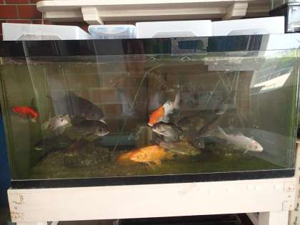 本校は、淀川のすぐ横にある学校ですが、なんと正門から入って校舎の入り口に淀川の魚が泳いでいます。赤・白・ぶち・黒の鯉、ふな、スヌムツ??がゆらゆらと、そして不動のタニシ。児童のおうちの方が定期的に来られて、水槽の管理やえさの世話などをされています。ご苦労様です。