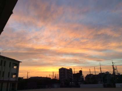 一年に何度か運動場の向こう側に沈む夕日が美しい日があります。今日は雲に隠れた夕日が空全体をオレンジ色に染めて、雄大な空の広さを感じる夕焼けでした。