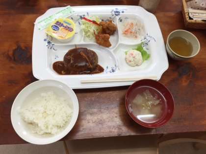 林間学習の1日目の夕食です。子どもたちの好きなハンバーグなどがたっぷり、スープもお出汁がきいて美味しいです。ご飯とスープはおかわりができます。