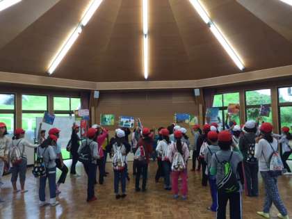 各班で旗を先頭に集合しています。これからグリーンウォークに出発して、その後、カレー作りをする予定です。