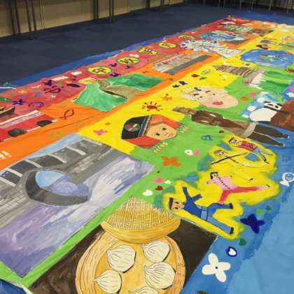 9月26日(月)の放課後、代表の児童が集まって、絵画の制作をしました。みんなで描いた大阪と中国の風景や食べ物などの周りに、好きなものを描いていきました。完成まであと少しです。