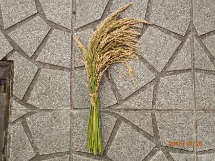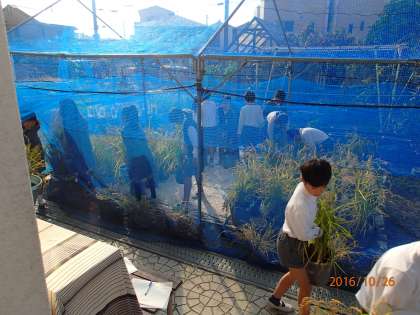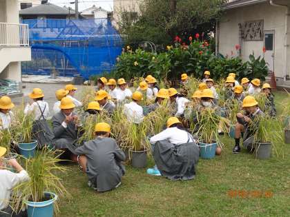 一つの穂から約90粒のモミが取れるそうです。児童は、自分の刈り取った(はさみで切った)モミ束を大事に教室に持っていきました。田植えから稲刈りまで経験し、植物を育てて食べることによってたくさんのことを学ぶことでしょう。