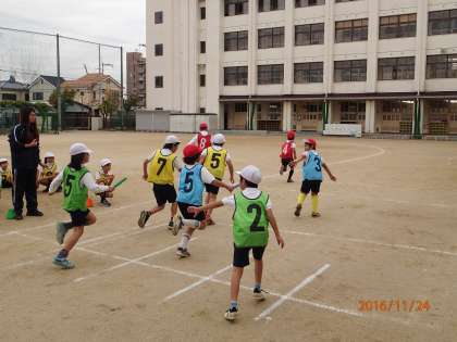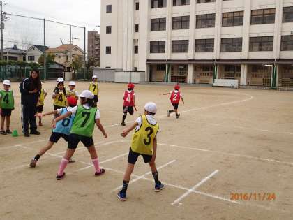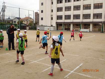 前走者との距離を測りながらスタート、スピードを上げながら「ハイ」の掛け声とともにバトンパス、スピードを落とさずスムーズな受け渡し。指導する前より5秒も縮めたチームもありました。
