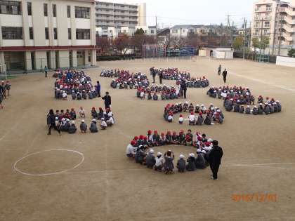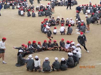 今日の児童集会は、「くるくるリレー」です。キッズファミリーのグループ対抗で、名前の通り円の周りをくるくる回りながら次の人にタッチして競走します。アンカーが円の中心においてある球を先にとったほうが勝ちとなります。