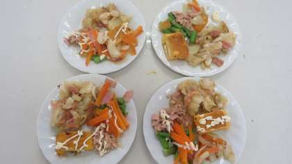 メニューもさまざまで、とてもおいしそうでした。たまごやき、スクランブルエッグ、具だくさんオムレツ、ハンバーグ、ポテトサラダ、ベーコンアスパラ巻き、ベーコンアスパラにんじんたまねぎの炒めもの、ジャーマンポテトなどなど。子どもたちはそれぞれに考えて作ったおかずを笑顔いっぱいで食べていました。本当に上手にできていました。
