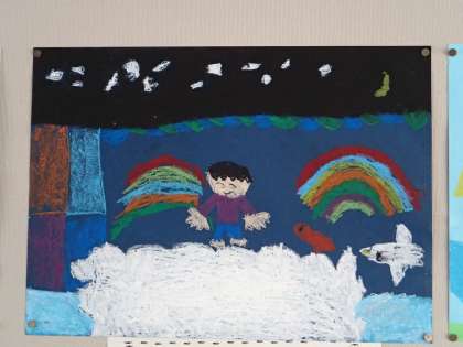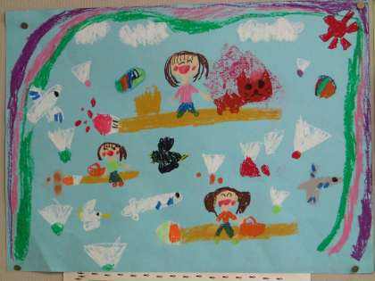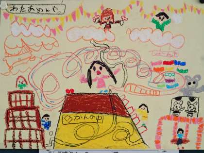 さて、子どもたちの絵は、「〜してみたい」が画面いっぱいにあふれています。それはその世界に入っている自分の表情にあらわれています、うれしそうですね。