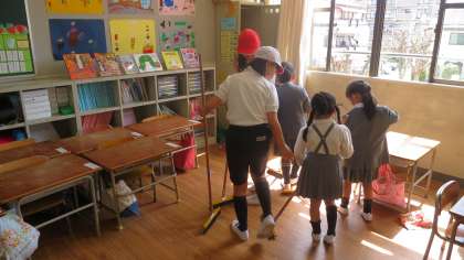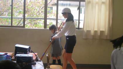 1年生も入学してから一週間以上が過ぎて、学校にも少し慣れてきたころです。掃除の時間には体に比べて少し大きいほうきを持って、がんばって教室の掃除をします。今は6年生がお手伝いに来てくれています。一緒に掃除をするだけでなく、道具の使い方や机の運び方などもやさしく教えてくれています。教える側の6年生も少し照れながら接しているのが、見ていてとてもかわいらしかったです。