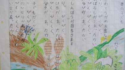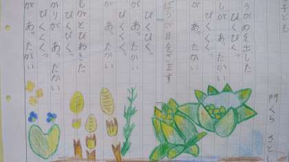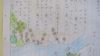 3年生の教室を訪れると、かどくらさとしさんの「春の子ども」という詩を音読したりイメージしたりしながら、春のようすについて考えを深めたり、ていねいに視写したりしていました。教室の後ろに貼ってある子どもたちの描いた絵がなんともほのぼのしていて、ぽかぽかと温かい気持ちになりました。子どもたちはこの詩を読んで、どんなことを思うのでしょうか。子どもの感性はすばらしいので、きっと多様な意見が出るのでしょうね。