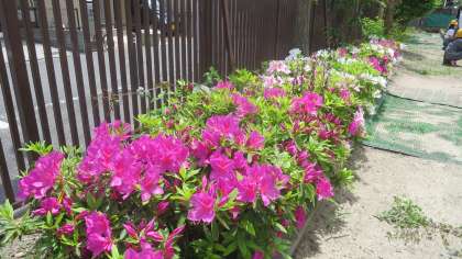 体育館の裏側にサツキツツジの垣根があります。今が見頃で咲き誇っています。きれいですね。しかし、体育館の裏側は目が届かないため、子どもたちが自由に遊びにいけないようにしています。サツキツツジも少しさびしそうです。また先生と一緒に見に行ってもらうことにします。