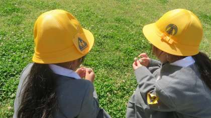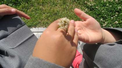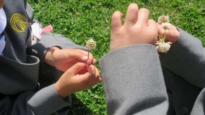 今日もとてもいい天気、運動場だけでなく芝生広場でもたくさんの子どもたちが遊んでいます。芝生の上を走ったり寝転んだりして、みんな気持ちがよさそうです。その中で1年生の女の子が二人、ちょこんと座っているのを見つけました。ひなたぼっこでもしているのかなと思ってのぞいてみると、シロツメクサをつんでいました。「見て見て、シロツメクサのゆびわだよ」「シロツメクサでかんむりも作れるんだよ」と話してくれました。なんだかほのぼのしていて、とてもあたたかい気持ちになりました。