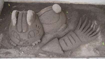 正門をくぐると、キンモクセイの木があります。その下の植え込みのところに、ときどき砂のオブジェ?が現れます、管理作業員さんが子どもたちに喜んでもらえるようにお仕事の合間をぬって制作してくれています。子どもたちは目ざとく気づいて、すぐに近寄ってのぞき込んでいます。かわいいですよね。でもどうしてねこの横にイカなんでしょうね。砂でできているので次第に壊れていくのは仕方ないのですが、ときどき現れるので楽しみです。あとキンモクセイの葉の部分がなんとなく顔に見えませんか。ハロウィンのかぼちゃみたいですね。少しこわい感じにも見えますが、実は下校する子どもたちに「今日も楽しかったな」「明日も元気に登校するんだよ」と声をかけているのです。さてこちらの方は、何人の子どもたちが気づいているのでしょうか。