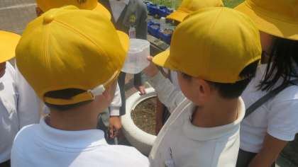 オケラを発見しました。最近ではあまり見かけなくなりましたが、以前は田んぼの中や土を掘り返すとよく見かけましたよね。すばしこくてかなりユーモラスな動きをします。下半分はコオロギによく似ていて、上半分はザリガニのような独特な形態をしています。子どもたちもはじめはコオロギだと言っていました。でも前脚がシャベル状になっているのでびっくり、不思議がっていました。この虫はなんだろう…オケラです。子どもたちは興味津々でオケラを眺めていました。