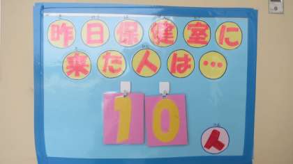 保健室のドアには写真のような掲示物が貼ってあります。これは前日に保健室に調子が悪かったりケガをしたりして、保健の先生にようすをみてもらいにきた子どもたちの人数です。昨日は10人でした。保健の先生に聞くと、「10人という数は普通かな」ということでした。子どもたちには安全に過ごすように指導していますが、やはり元気に走り回って遊ぶ子も多いです。けがをせずに遊べるといいのですが…。でも保健の先生がいるから子どもたちも安心しているのかもしれませんね。