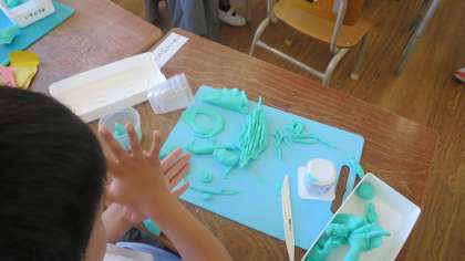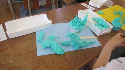 1年生が図画工作の授業でねんどをしていました。黒板を見るとテーマが書いてありました。テーマは「ごちそうパーティーをひらこう」です。子どもたちに聞いてみるとケーキやドーナツ、イチゴなどをつくっているそうです。やっぱりデザート系が多くなっちゃうんですね。