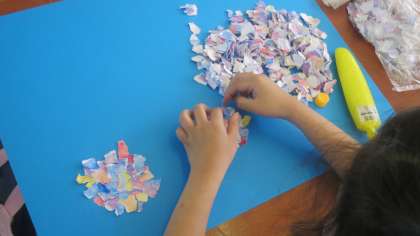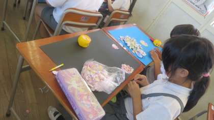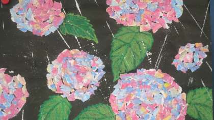 3年生がアジサイをつくっていました。ちぎった紙を一つ一つていねいにのりで貼りつけていきます。細かな作業ですが、みんな時間を忘れてもくもくと活動していました。アジサイの葉は、まず絵具でグラデーションした画用紙を水にぬらしてかるくくしゃくしゃにするそうです。そして乾かしてからていねいにちぎってビニール袋に集めていきます。こうすることで立体感が出るそうです。結構、手間がかかってるんですね。子どもたちは小さなアジサイ、大きなアジサイ、ちょっと形の変わったアジサイ…いろいろ楽しみながら貼っていました。