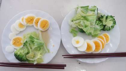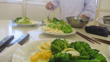 さあ、できあがり。仕上げにドレッシングをかけます。1枚目の写真はかなり大盛りですね。大丈夫かな。でもなかなかいい感じにできましたね。盛り付けも各個人でそれぞれ少しずつ違います。おいしそうですね。普段野菜はあんまり…という子も初めての調理実習で気持ちも高まったのか、いくらでも食べていました。きっと後で後悔しそうな…(笑)