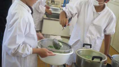 5年生が調理実習をしました。メニューは温野菜サラダです。使った食材はキャベツ、ブロッコリー、たまごです。ドレッシングは酢、ごま油、しょうゆで作る中華風です。キャベツは一枚一枚ていねいに洗って、しんの部分は取ります。ブロッコリーは食べやすい大きさにカットします。お湯が沸騰したら野菜を2〜3分ゆでます。非常にシンプルな料理ですが、子どもたちには初めての調理実習でガスコンロや包丁など、少しドキドキの子もいました。でも友だちと協力して役割分担しながら何とか進めていきます。中にはてきぱきと指示する女の子もいて、男の子はうつむいてだまって動きます(笑)