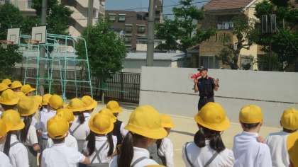 土曜授業として、避難訓練と安全安心教室が行われました。消防署や社会福祉協議会、知地域防災リーダーの方々に来ていただいて、さまざまな体験をさせていただきました。避難訓練では落ち着いて素早く行動することがかなり身についてきました。校長先生からは「いつ火事や災害が起こるかもわからないので、いつでも先生の指示をしっかりと聞いて真面目に行動することが大切です」という話がありました。消防署の方からは、いざという時のけが人の運び方なども教えていただきました。その他にも、火災のおそろしさや突然の大雨、雷雨、洪水などについても学び、また水消火器体験、煙体験、アイマスク体験などを行いました。子どもたちの防災意識も高まったと思います。お手伝いをしていただいた方々、土曜日という休みの暑い中、本当にありがとうございました。今後ともよろしくお願いいたします。