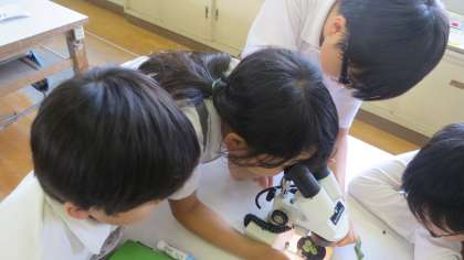 科学クラブでは「双眼実体顕微鏡」の使い方について学習していました。観察するものの中には葉の裏についたアブラムシや理科室のタニシなどもあり、子どもたちは大騒ぎ。目では1〜2mmほどにしか見えないのですが、レンズをのぞくと体の構造までばっちり!「うあ〜」「なんやこれ」「気持ち悪い」「かわいい」賛否両論です。子どもたちはなんだかんだ言いながらも何度も顕微鏡をのぞき込んでいます。