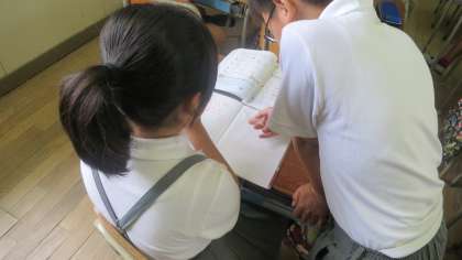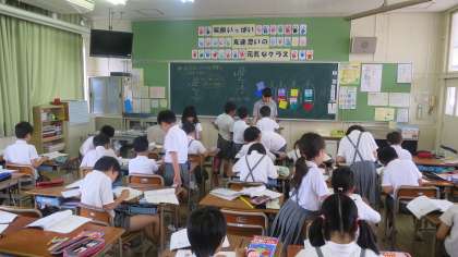 4年生が筆算の学習をしていました。62÷3のように商の一の位に0を書く場合についてです。子どもたちは初めてのパタ−ンに少しとまどっていましたが、だんだんコツをつかんできたようでした。先生に○をつけてもらってとてもうれしそうにしていました。次に驚いたことがあります。自分が終わったら、まだできていない友だちやつまずいている友だちに進んで教えて回っているのです。そういう光景が教室のあちこちで見られました。実はこの学習形態はとてもいいことなのです。教えてもらう側もわかるし、教える側もさらに伸びます。時間も無駄にしません。そして信頼関係も生まれます。すべての学習においてできることではありませんが、こういう活動はぜひ増やしていきたいと思いますね。