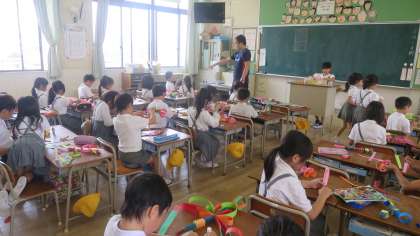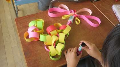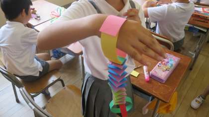帯状に切った画用紙をたくさん用意して、じゃばら(?)のように折り込んでバネのようにしたり、いろいろな形の輪を作ってのりではり合せたりしていました。なかなか細かくていねいな作業で、根気がいりそうです。そして想像もふくらみます。