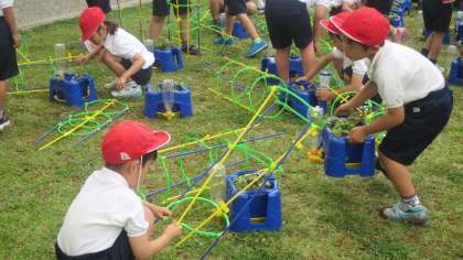 1年生がアサガオの支柱を立てていました。